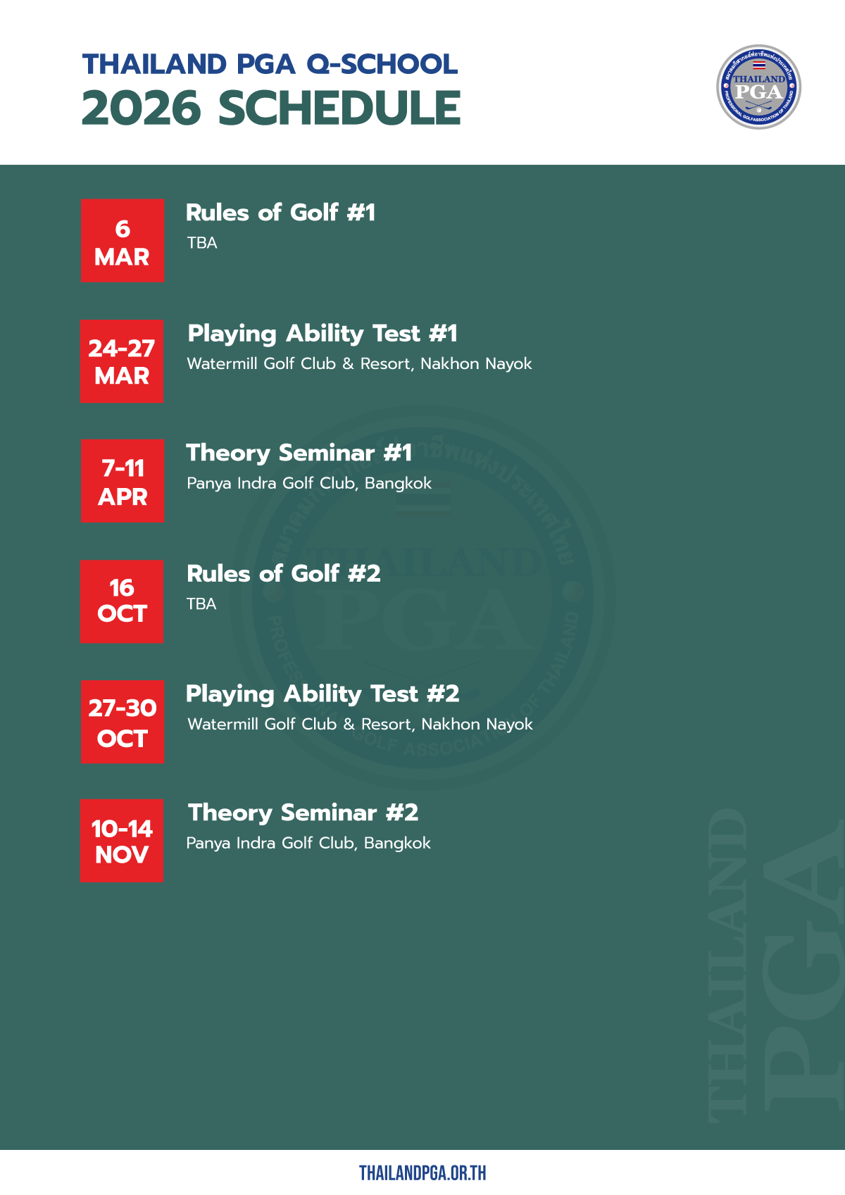 | 24-27 มี.ค. 69 | Playing Ability Test #1 | สนามวอเตอร์มิลล์ กอล์ฟ คลับ แอนด์ รีสอร์ท จ.นครนายก |