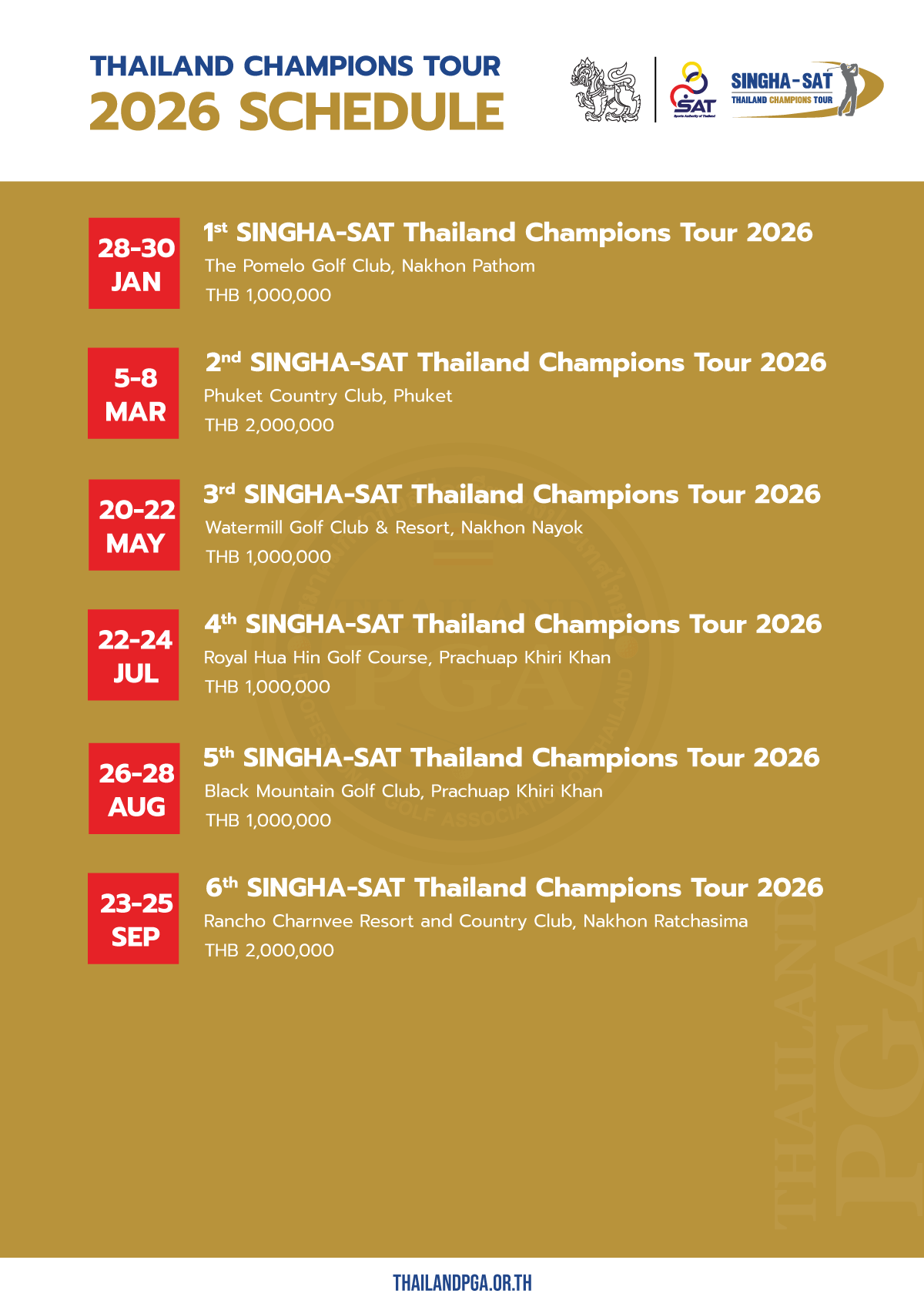 | 5 | 26-28 ส.ค. 69 | 5th SINGHA-SAT Thailand Champions Tour 2026 | แบล็ค เมาเท่น กอล์ฟ คลับ จ.ประจวบคีรีขันธ์ | 1,000,000 | - |