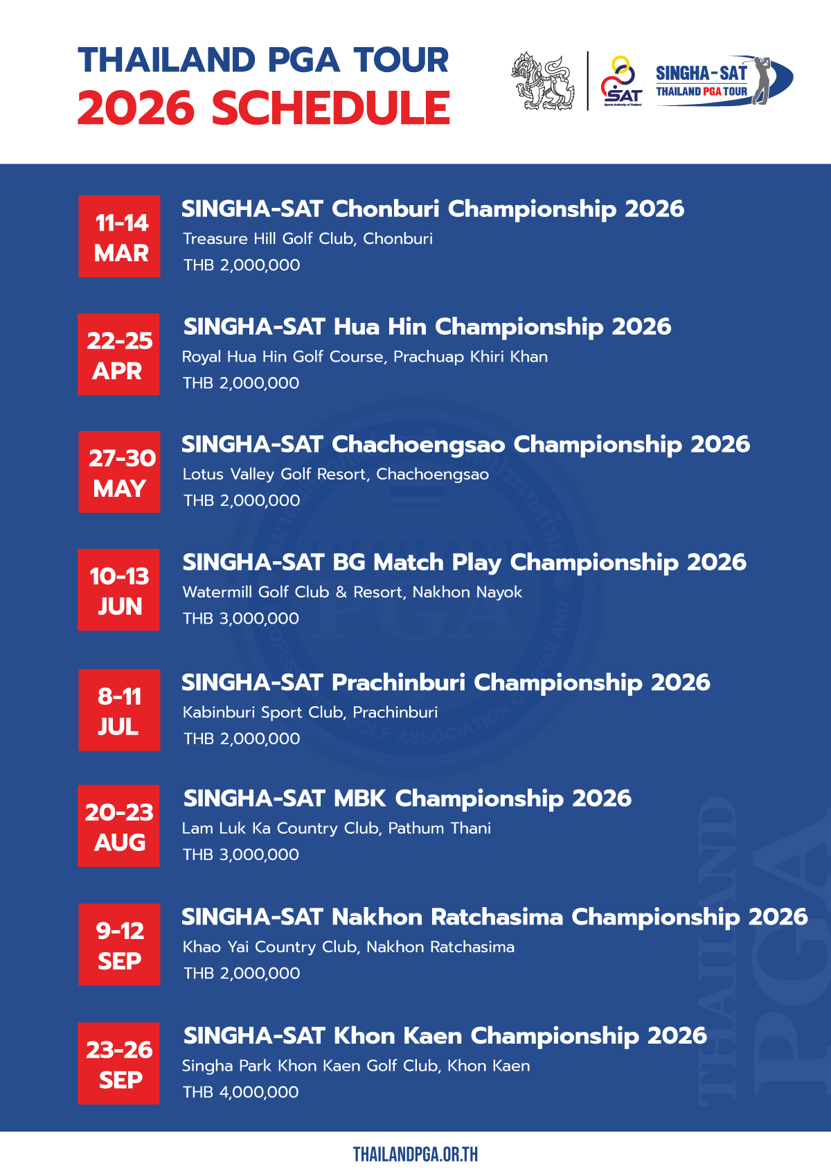 | 4 | 10-13 มิ.ย. 69 | SINGHA-SAT BG Match Play Championship 2026 | วอเตอร์มิลล์ กอล์ฟ คลับ แอนด์ รีสอร์ท จ.นครนายก | 3,000,000 | - |