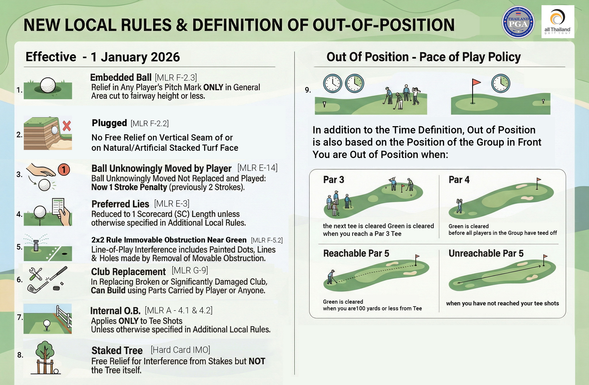 Home ข่าวสาร NEW LOCAL RULES & DEFINITION OF OUT-OF-POSITION (Effective 1 January 2026) ข่าวสารประกาศTHAILAND PGA TOURTHAILAND DEVELOPMENT TOURTHAILAND CHAMPIONS TOUR NEW LOCAL RULES & DEFINITION OF OUT-OF-POSITION (Effective 1 January 2026) By Thailand PGA - 20/01/2026 16 NEW LOCAL RULES & DEFINITION OF OUT-OF-POSITION (Effective 1 January 2026) ปี 2026 R&A และ USGA ได้กำหนด Local Rules ใหม่และทุกทัวร์ทั่วโลกได้บังคับใช้ Local Rules นี้ รวมถึงทัวร์ในประเทศไทย - ผู้สนับสนุนอย่างเป็นทางการ -
