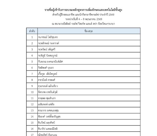 หลักสูตรการอบรมเพิ่มทักษะและเทคโนโลยีขั้นสูง สำหรับผู้ฝึกสอนอาชีพและนักกีฬาอาชีพกอล์ฟ ประจำปี 2569